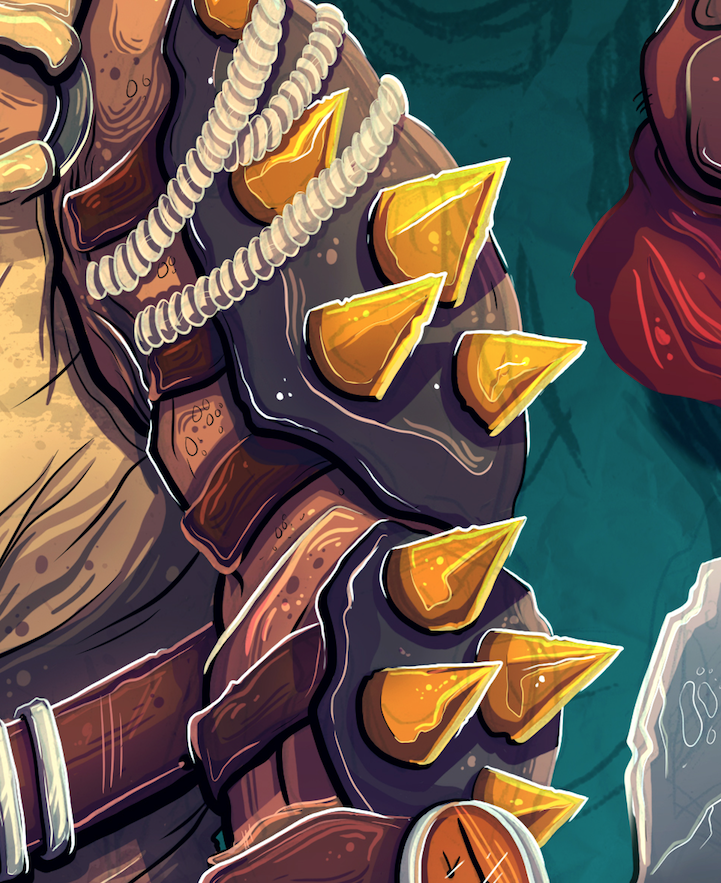Because his livelihood is based highly on what he can find to either sell or work with, I made sure that he had extra storage from a big sack on his bag, a pocket on his front and some extra little pockets on his arm. When he makes weapons he will often have to work with metals and have a few blacksmith skills! I want this guy to be super efficient to the point where he has everything he needs to do what he does, no matter where he is. So he has an enchanted piece of shoulder armour which he can pour molten lava from for any metal work, or to use against enemies if needed! The lands are dangerous, so he also needs to protect himself, the spiked arm guard isn't just for show!